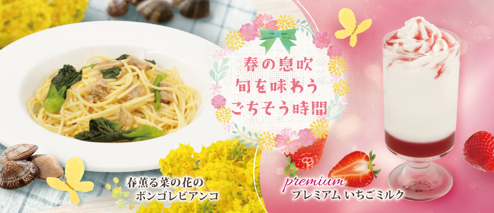 3月16日(月)開始 期間限定ドリンク&パスタ『プレミアムいちごミルク』『春薰る菜の花のボンゴレビアンコ』